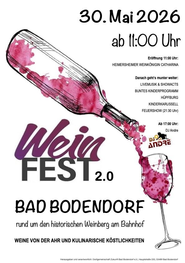 Am 30. Mai 2026 feiert Bad Bodendorf ab 11 Uhr die Rückkehr seines beliebten Weinfests auf dem Bahnhofsvorplatz. Die Vorfreude im Ort ist groß, denn das traditionsreiche Fest gilt seit jeher als gesellige Begegnungsstätte für Jung und Alt. Organisiert wird das Fest von einem Arbeitskreis der Dorfgemeinschaft Zukunft Bad Bodendorf e.V., der bereits seit Monaten Vorbereitungen trifft.